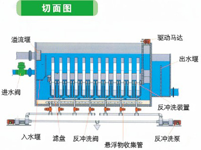 滤布转盘微滤器主要由;滤池箱体、滤盘组、滤盘抽吸反洗机构、排泥管机构、滤盘集水中心筒、滤盘清洗驱动机构、自动控制器、抽吸清洗泵、自控阀。