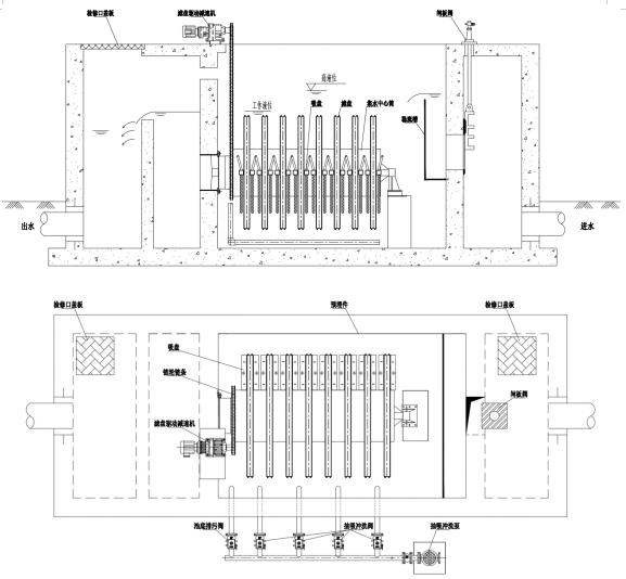 (1)静态过滤过程:污水重力流进入滤池,滤池中设有进水挡板稳流。污水通过滤盘两侧滤布进行过滤,过滤液通过集水中空筒收集,重力流通过溢流槽排出滤池。整个过程为连续。