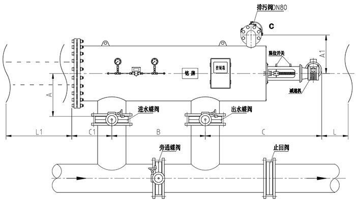 污水在排污时通过排污口排出,压差开关持续检测滤网内外的压差,当达到预设值时将传递一个开关信号到控制箱启动一次清洗循环。