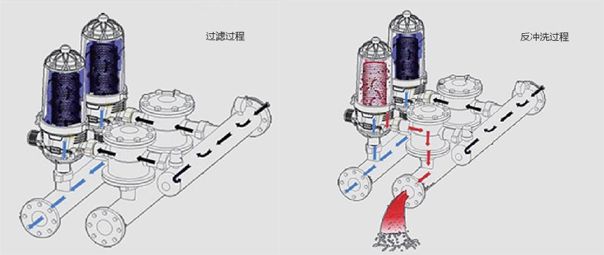 过滤系统有两种运行状态:过滤状态和反冲洗状态。