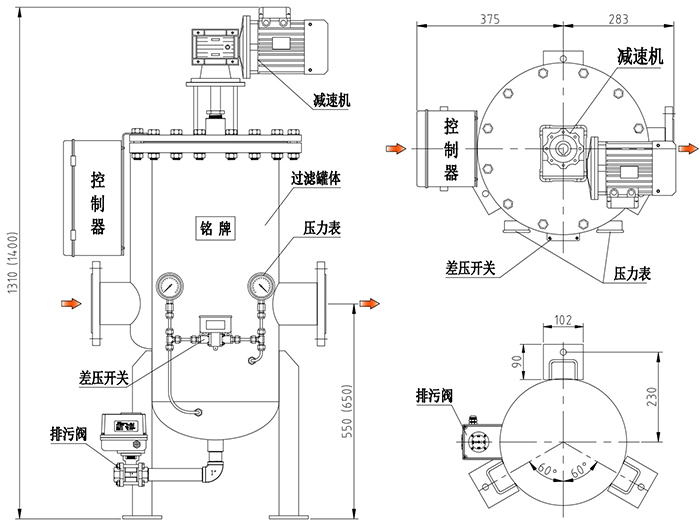 采用工业单片PLC自动控制,中文或英文显示。可根据压差或定时控制过滤器自动清洗,并可手动、强制清洗。现场可设定过滤时间、清洗时间。运行信号、清洗信号、故障信号输出及485通讯接口。